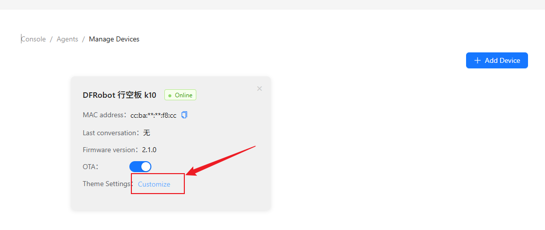 Starting from version 2.x, xiaozhi firmware supports custom themes and wake-up words without requiring a full source code compilation. After binding your xiaozhi device to the xiaozhi.me website, you can click βCustomizeβ to configure your settings.
