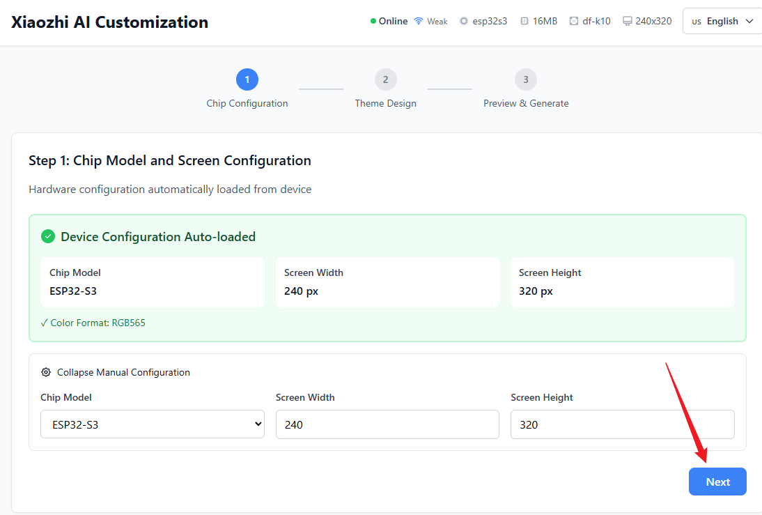 First, confirm that your hardware setup is an ESP32-S3 with a screen resolution of 240Γ320. Then click βNextβ.