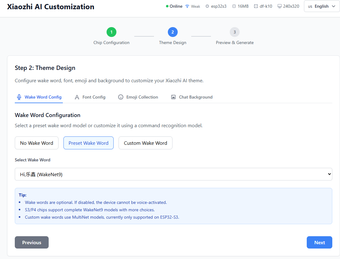 On the next step, you can configure the wake word, font, Xiaozhi's expressions, and background image. The wake word can utilize the βPreset Wake Wordβ officially supported by ESP32, or be fully customized to your own wake word. After completing all settings, please proceed by clicking "Next".