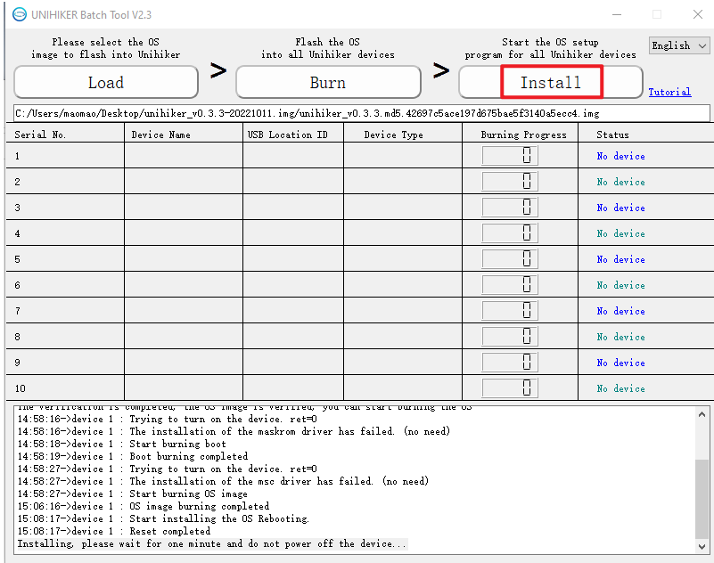 - Once the firmware has finished flashing, click on "Install" to begin the installation process. The software will control all UNIHIKERs to restart and complete the installation of the new system.